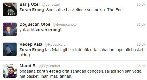 Başarı basketbolcumuz Erceg'in attığı bu basketin ardından mikro blog sitesi twitter'da siyah beyazlı taraftarlar şu yorumları yaptılar: