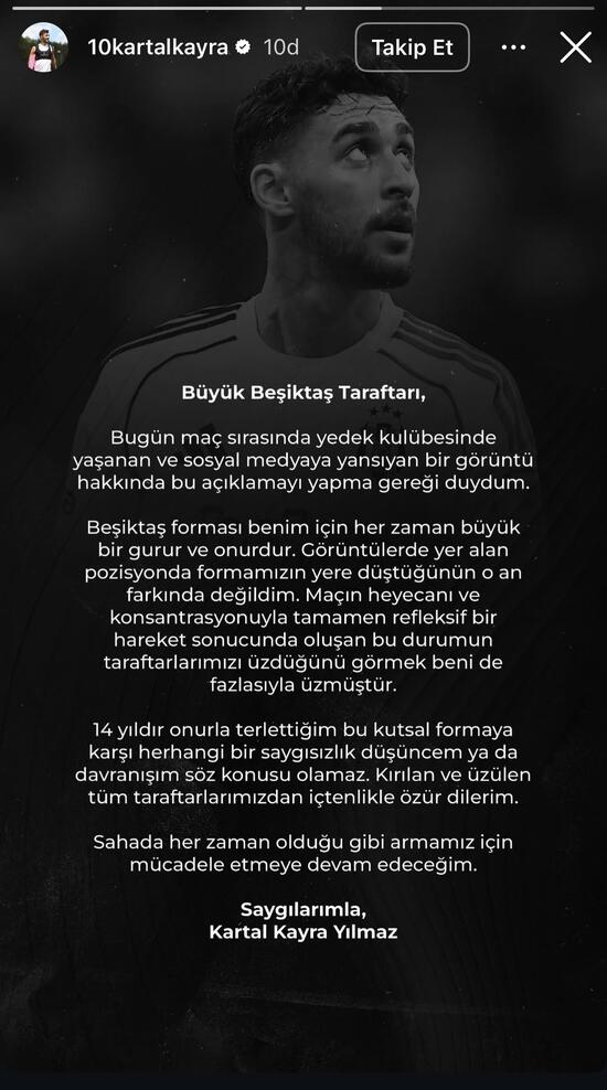 Kartal Kayra Yılmaz'ın yedek kulübesinde Beşiktaş formasını ayağıyla ittiği görüntü sosyal medyada gündem oldu. Tepkilerin ardından 25 yaşındaki futbolcu özür diledi.
